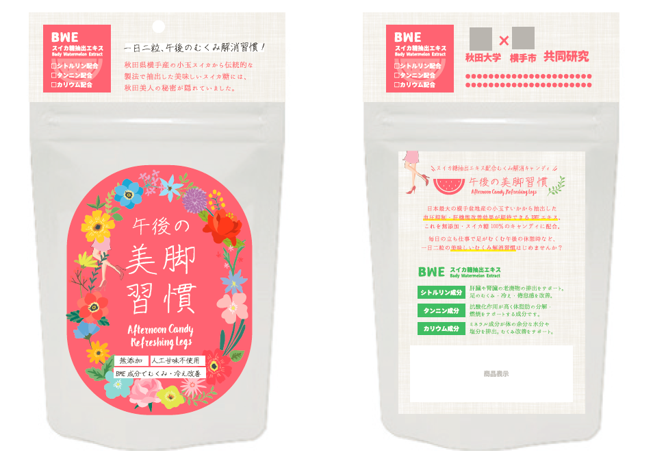 | 食材・製造のこだわり | 原材料はBWEエキス・水飴・甜菜糖のみです。BWEエキス(Baby Watermelon Extract の略)は、国立大学法人秋田大学と秋田県横手市の共同開発による特許( 特許第5924563 号)です。秋田県横手市雄物川町は北限最大のスイカの産地と言われています。寒暖の差が育むスイカはとても美味しく、栄養価も豊富です。また成熟したスイカと比較して、小型の未成熟なスイカの抽出物(BWE エキス) には、生活習慣病の予防に役立つ成分が含まれていることがわかりました。さらに、アミノ酸の一種であるシトルリンも高含有であることがわかりました。 |